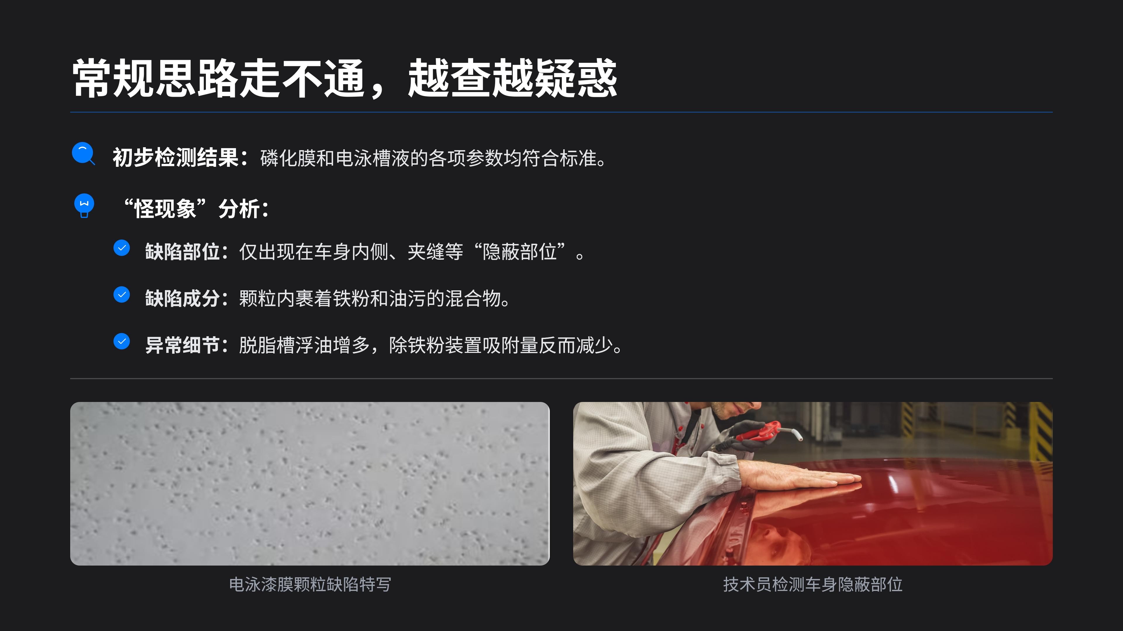 缺陷部位分析:用放大镜看颗粒,发现里面裹着黑色小碎屑,刮下来化验,居然是铁粉和油污的混合物 —— 这就奇怪了,脱脂、除铁粉、磷化三道工序,怎么还会有这两样东西残留?